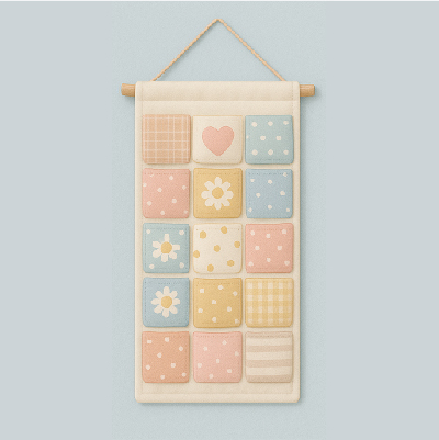 Frases especiales como “Feliz Cumple”, “Te amo mamá” o “Bienvenido bebé”, formadas por letras de tela. Ideales para celebraciones o detalles emotivos hechos a mano.